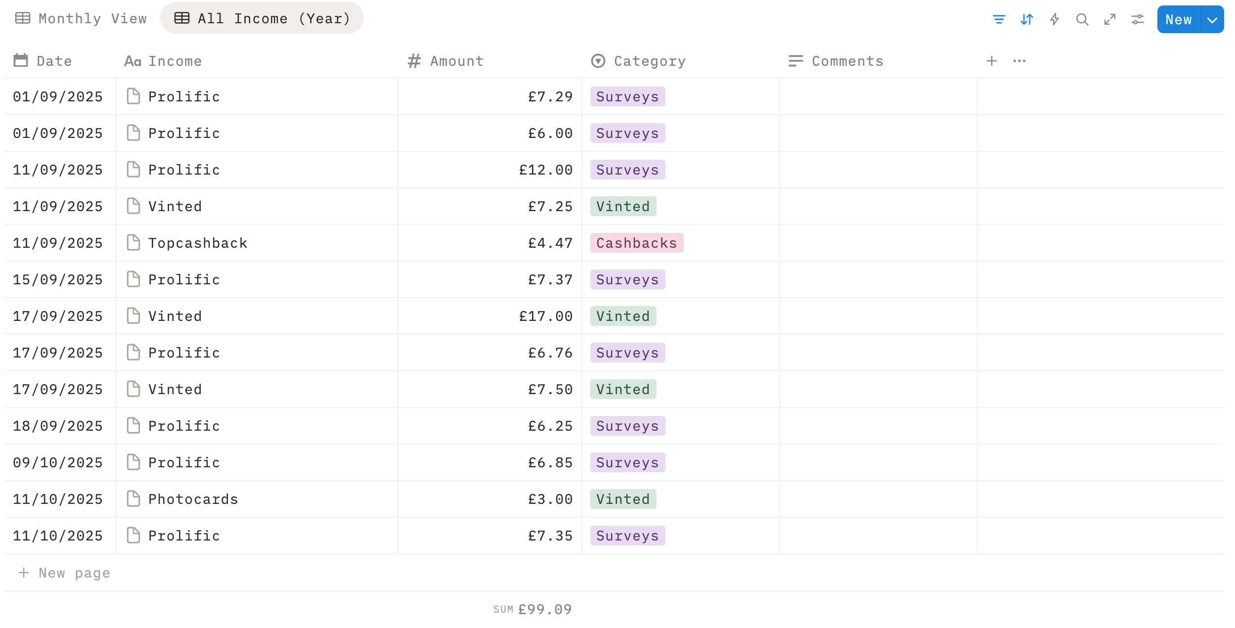 - Any side hustle incomes (Vinted, surveys, cashback payouts, etc.)